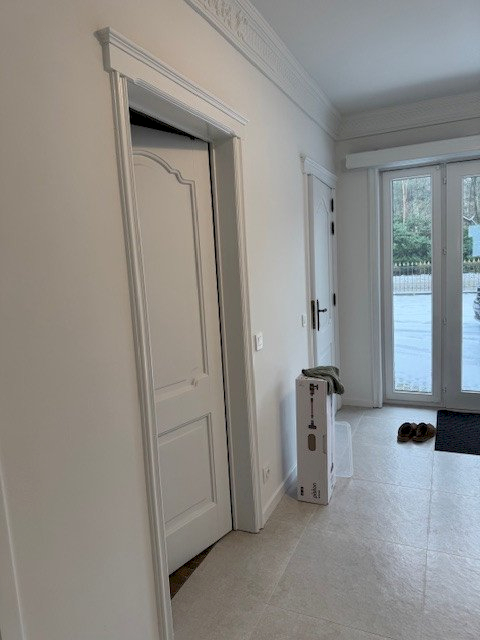 Ook in de gang krijgen de donkere deuren een witte afwerking, na het nodige voorbereidende werk.