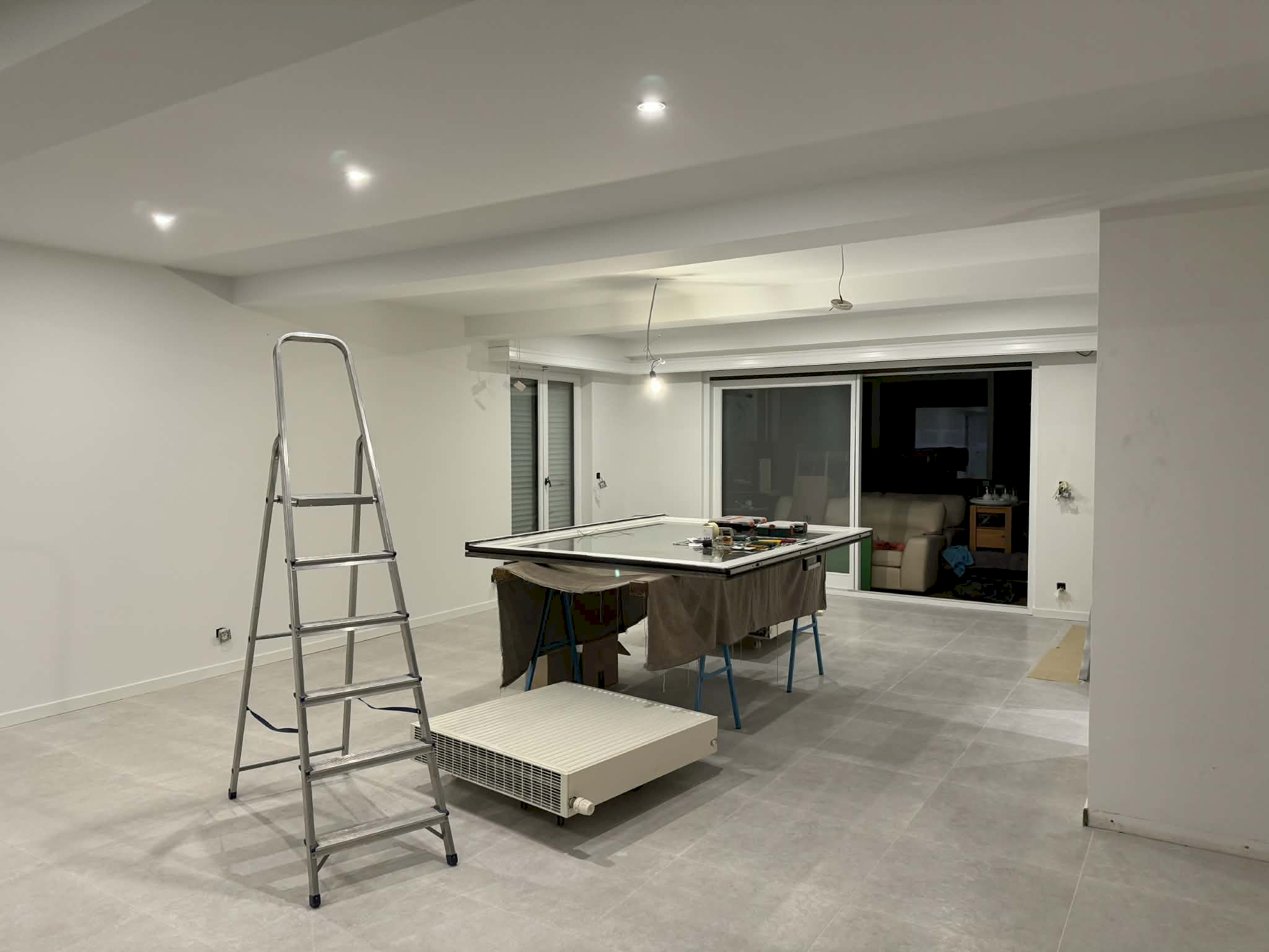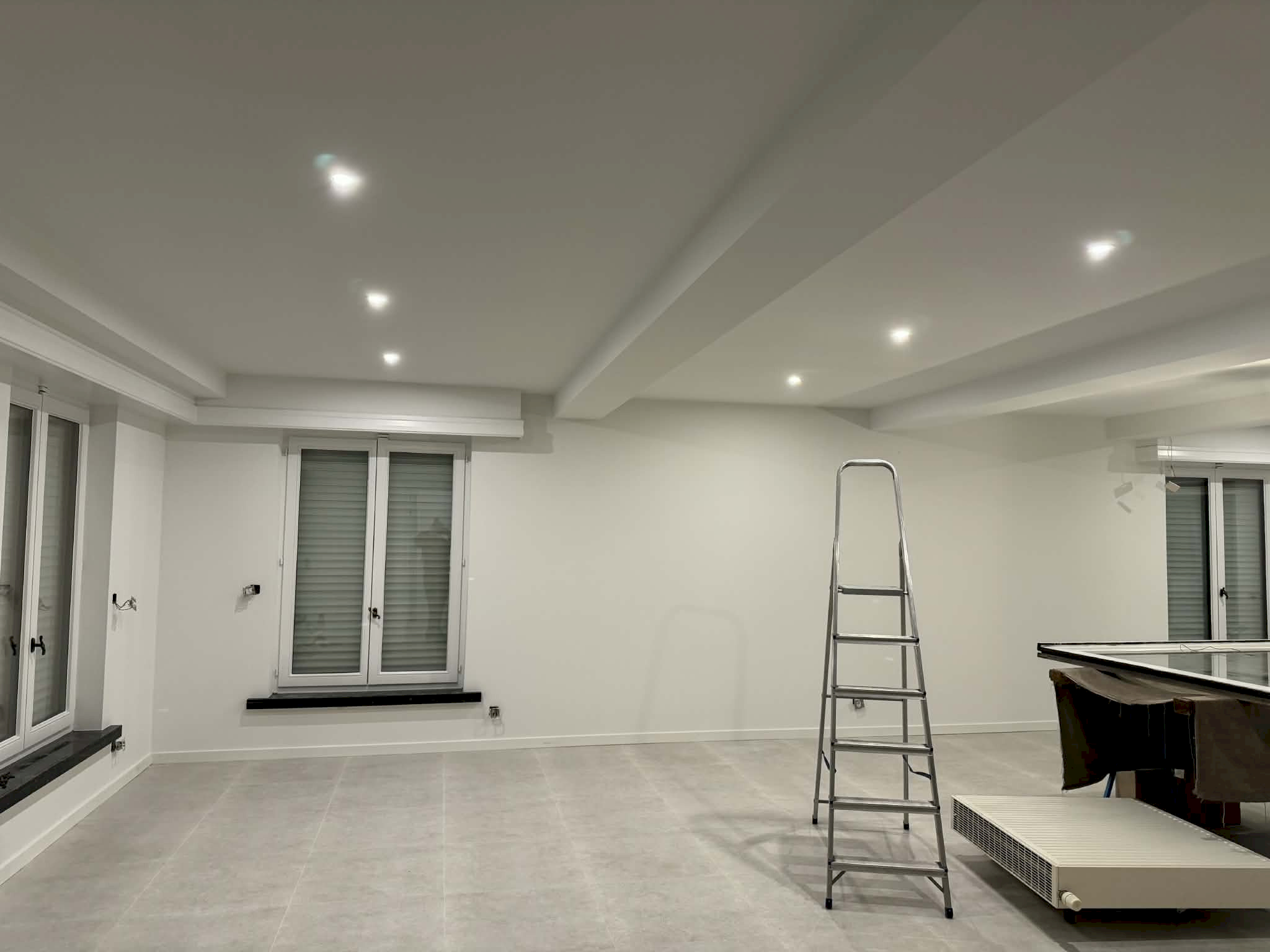 Wanneer al deze stappen door de aannemer uitgevoerd zijn, kan aan de afwerking worden gestart. Alle voorbereidingen worden getroffen, zoals het afdekken van vloeren en vensterbanken en het afplakken van de ramen en deuren. Alle muren en plafonds worden bijgewerkt en afgeschuurd, waarna de primer kan worden aangebracht. Opnieuw gaan we rond met plamuur om eerder gemiste oneffenheden nog bij te werken. Wanneer de plamuur droog is kunnen de afwerkingslagen in de definitieve kleur op de muren en het plafond.