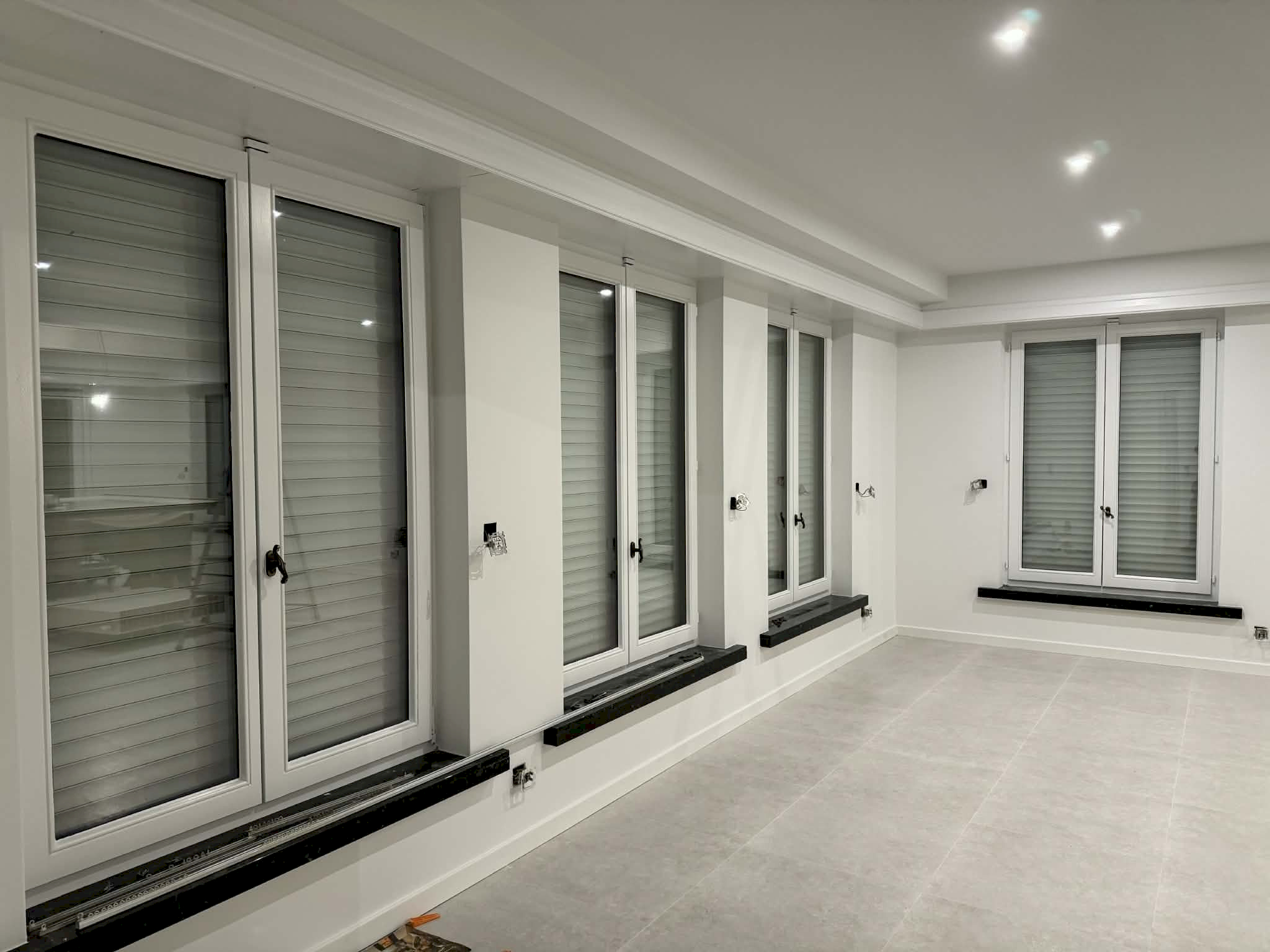 De donkere ramen worden geschuurd en ontvet, waarna ze voorzien worden van een hechtprimer. De afwerking van de ramen bestaat uit drie lagen watergedragen lak met een satijn afwerking.